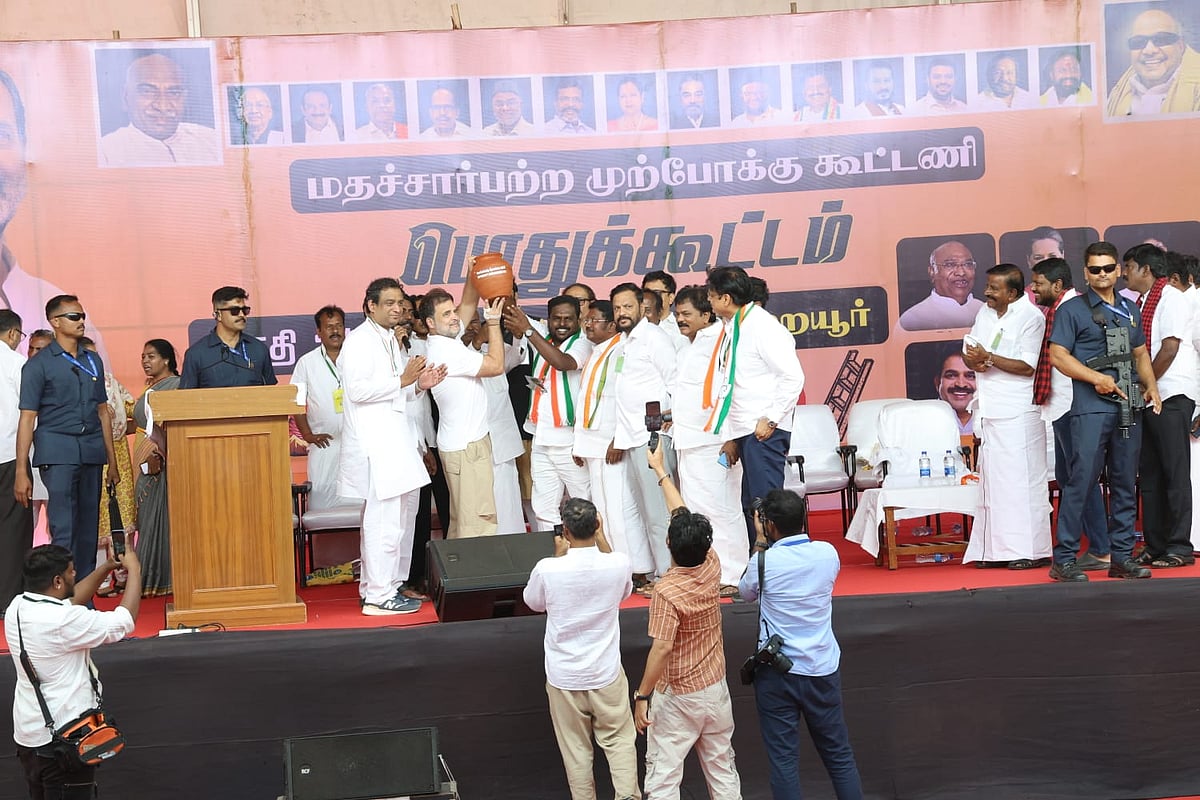 தி.மு.க தலைமையிலான மதச்சார்பற்ற முற்போக்கு கூட்டணி அதை அனுமதிக்காது. தமிழ்நாட்டிற்கும், எனக்கும் இருக்கும் பந்தம் மக்களாகிய உங்களுக்கு தெரியும். எனது தாத்தா, தந்தை, தாயார் தொட்டு இன்று நான் தமிழக மக்களுடன் நிற்கிறேன். தமிழக மக்களுக்கும் எனக்கும் உள்ள பந்தம் பாசம் அரசியலுக்கு அப்பாற்பட்டவை. தமிழ்நாட்டு மக்களின் டெல்லி பிரதிநிதியாக நான் என்றும் இருப்பேன். குறிப்பாக சொன்னால் தமிழ்நாட்டு மக்களின் சிப்பாயாக டெல்லியில் நான் இருப்பேன். தமிழ்நாடு மக்கள் தேவைகளை பூர்த்தி செய்யவும் தமிழ்நாட்டின் வளர்ச்சிக்காகவும் நான் போராடுவேன். தமிழ்நாடு மக்களை பார்க்க எனக்கு பெருமையாக உள்ளது. இந்த தேர்தலில் ஆர்.எஸ்.எஸை, பா.ஜ.க-வை மதச்சார்பற்ற முற்போக்கு கூட்டணி அகற்றும். மக்களாகிய நீங்களும் மதச்சார்பற்ற முற்போக்கு கூட்டணியை ஆதரிக்க வேண்டும். காங்கிரஸ் கட்சி வேட்பாளர்களைப் போல் கூட்டணி கட்சி வேட்பாளர்களுக்கும் சிறப்பான உழைப்பை நாம் கொடுக்க வேண்டும்" என்றார்.